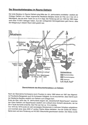 Braunkohleabbau bei Ostheim wurde erstmalig um 1840 nachgewiesen. Das Lagergebiet befand sich westlich des Dorfes. Weitere Abbaugebiete gab es zwischen 1870 bis 1879 im Bereich der jetzigen Grillhütte bei Sipperhausen und von 1901 bis 1927 im Gebiet des Hügelskopfes. Alle vorgenannten Bergwerksfelder wurden im Tiefbau betrieben.