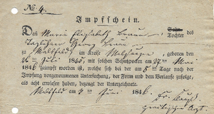 Hier sehen sie einen Impfschein, ausgestellt am 03. Juni 1846, über eine Pockenschutzimpfung von Elisabeth Braun aus Malsfeld.