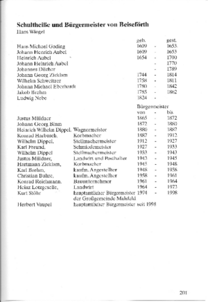 Anl. sehen sie eine Aufstellung mit den Bürgermeistern von Beiseförth der Jahre 1609 bis 1998 von Hans Wiegel.