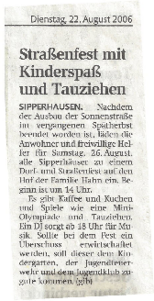 In den anl. PDF-Dateien sehen sie Presseartikel und Informationen zu Dorf- und Straßenfesten und einer Fotoausstellung  in Sipperhausen.