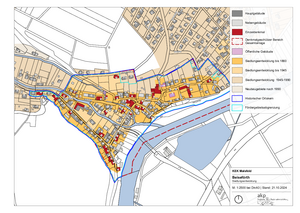 In der anl. Datei sehen sie eine vom Planungsbüro akp_ im Rahmen des Kommunalen Entwicklungskonzeptes erstellte Karte mit den Grenzen der Förderung, Siedlungsentwicklung, dem historischen Ortskern und dem denkmalgeschützten Bereich mit den Einzeldenkmalen.