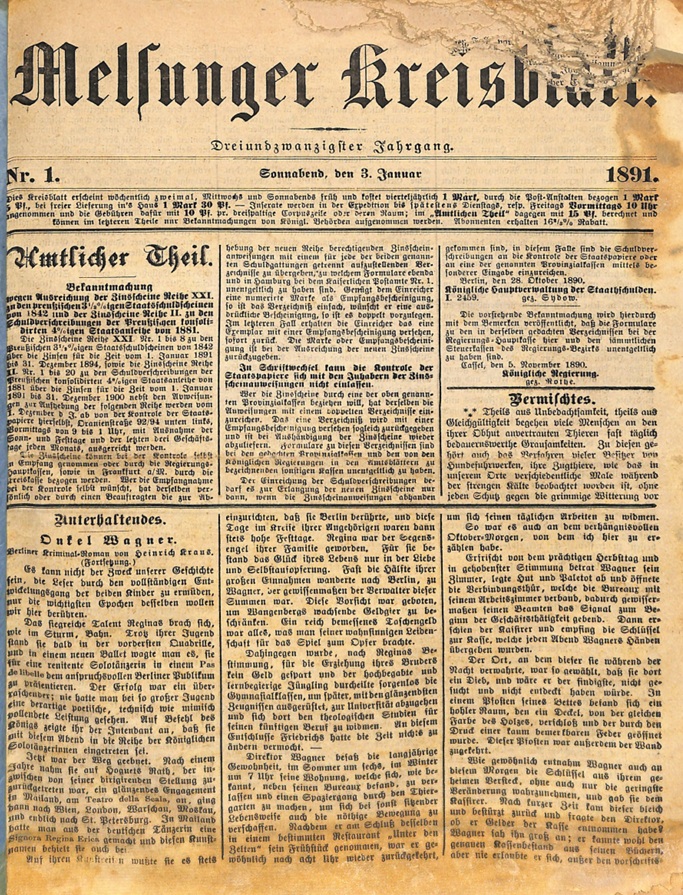 Anzeige vom Rittergut F. Heydenreich, Malsfeld über den Verkauf von Hafer und Kartoffeln 15. April 1891. Am 1 Mai 1891 wurde in der Peter`schen Gastwirtschaft zu Beiseförth der Rest des Holzeinschlages der umliegenden Bezirke verkauft. Die Brauerei Malsfeld bietet Anfang Mai frisch gebrautes Bockbier an. Am 7. Mai Concert in Malsfeld in " Richard's Wäldchen" mit der Kapelle des Musikdirektors Koch aus der Rheinpfalz (Bayern). Im Anschluß lädt R. Kettler in sein Bahnhofsrestaurant zum Tanzvergnügen ein. Aus Ostheim wurde am 13. August berichtet: Unfall mit einem Pferdegespann zwischen Sipperhausen und Ostheim. Die Pferde scheuten und gingen durch. Beide Söhne des Bauern sprangen vom Wagen. Der eine wurde am Bein schwer verletzt, der andere überfahren und starb. Fahrpläne ab dem 1. Oktober 1891 jeweils von der Königlichen Eisenbahn- Direktion Erfurt von Kassel nach Eisenach und zurück immer mit Halt in Malsfeld, und von der Königlichen Eisenbahn-Direktion Frankfurt von Treysa nach Leinefelde und zurück, Halt am Bahnhof in Malsfeld.