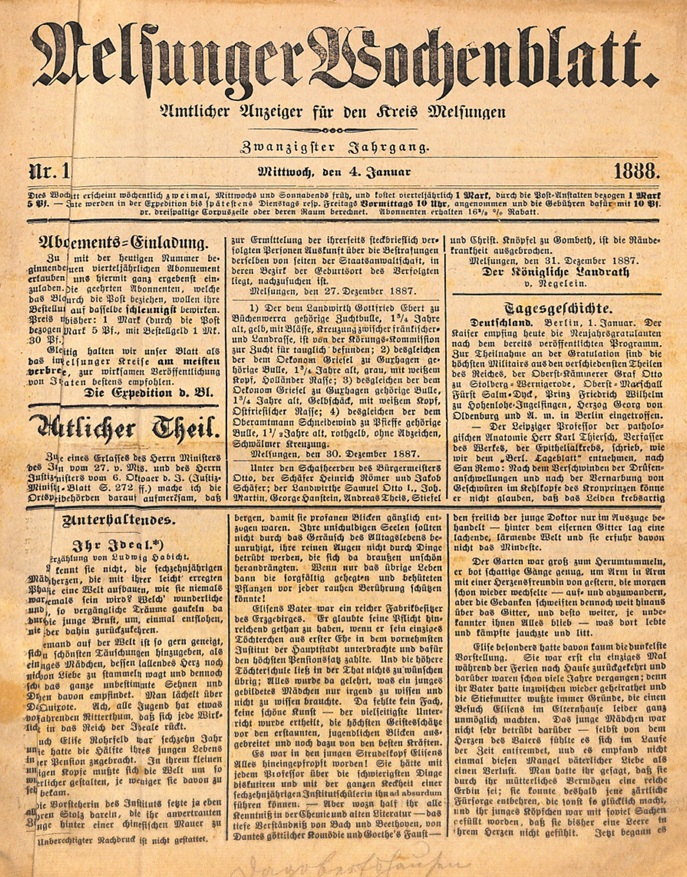 Hier ist ein Extrakt aus dem Melsunger Wochenblatt von 1888 mit Ereignissen, die die Gemeinde Malsfeld und seine Ortsteile betreffen.