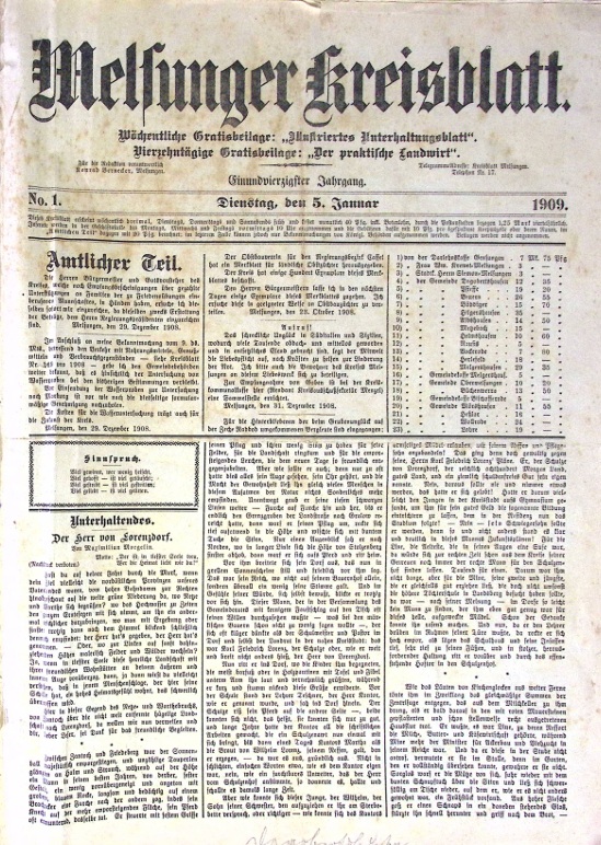 Z.B. Todesanzeige von Justus Dethof, Holzverkauf in Ostheim, Geburtstag des Eisenbahnvereins Malsfeld am 27. Januar1909 - Feier im Landesfeind`schen Saale, Turner-Ball vom Turnverein Dagobertshausen am 7. Febr. 1909 .