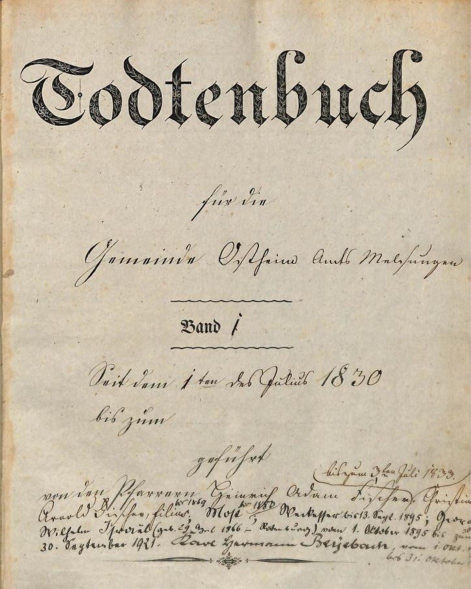 In dem Kirchenbuch sind die Gestorbenen in Ostheim der Jahre 1830 bis 1960 vermerkt.
