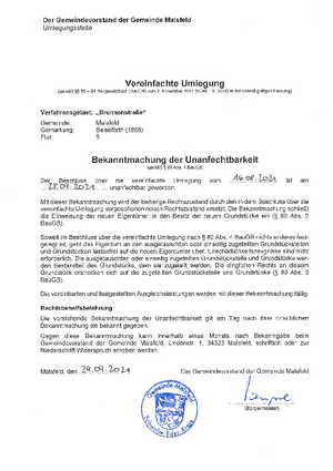 In einem Tauschverfahren für Grundstücke wurde im Jahr 2021 für die Flur 5, Gemarkung 1868, Brunnenstraße der anl. Umlegungsbeschluss veröffentlich.